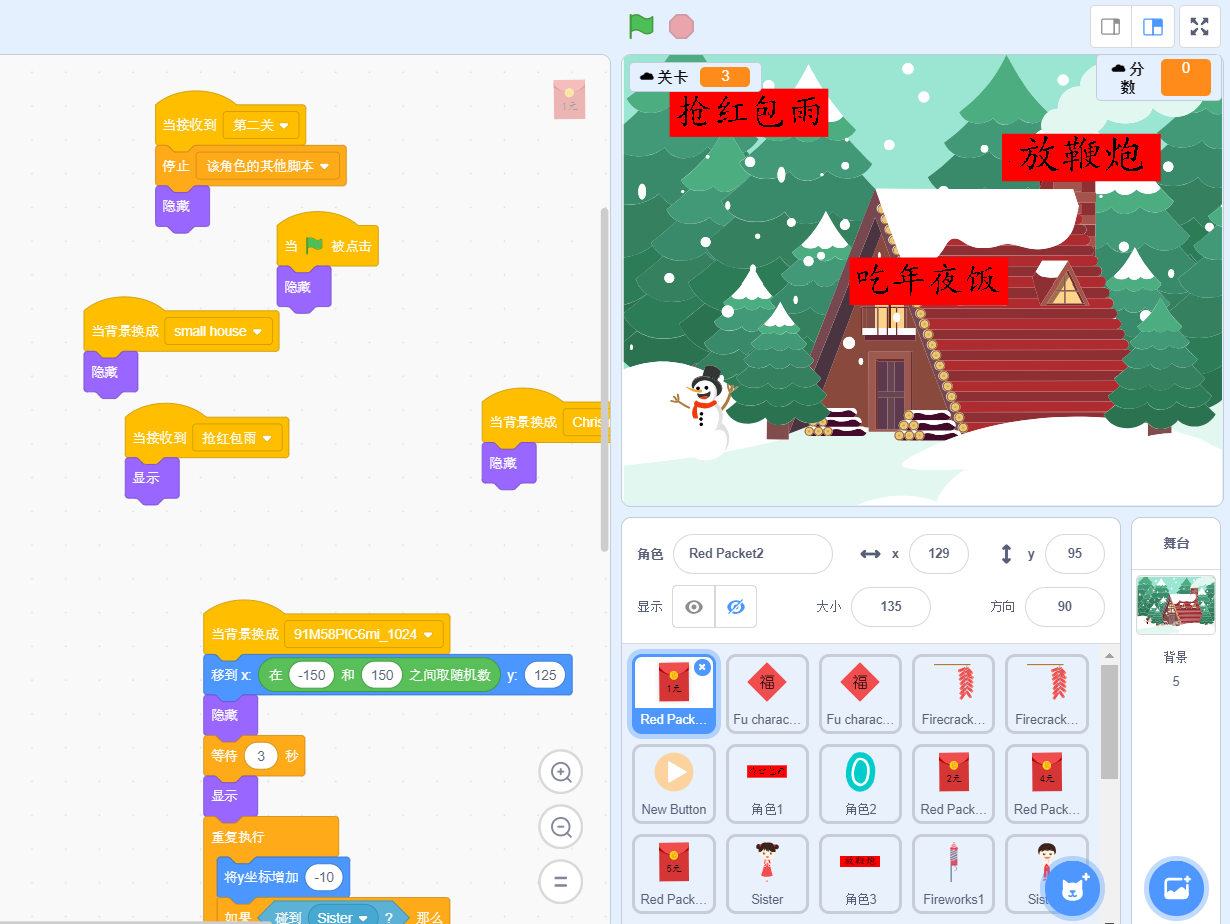 作品介绍: 利用scratch制作超有创意的过新年; 作品特色: 趣味、创意 作品归类: scratch作品源码 声明:本站所有文章,如无特殊说明或标注,均为本站原创发布。任何个人或组织,在未征得本站同意时,禁止复制、盗用、采集、发布本站内容到任何网站、书籍等各类媒体平台。如若本站内容侵犯了原著者的合法权益,可联系我们进行处理。