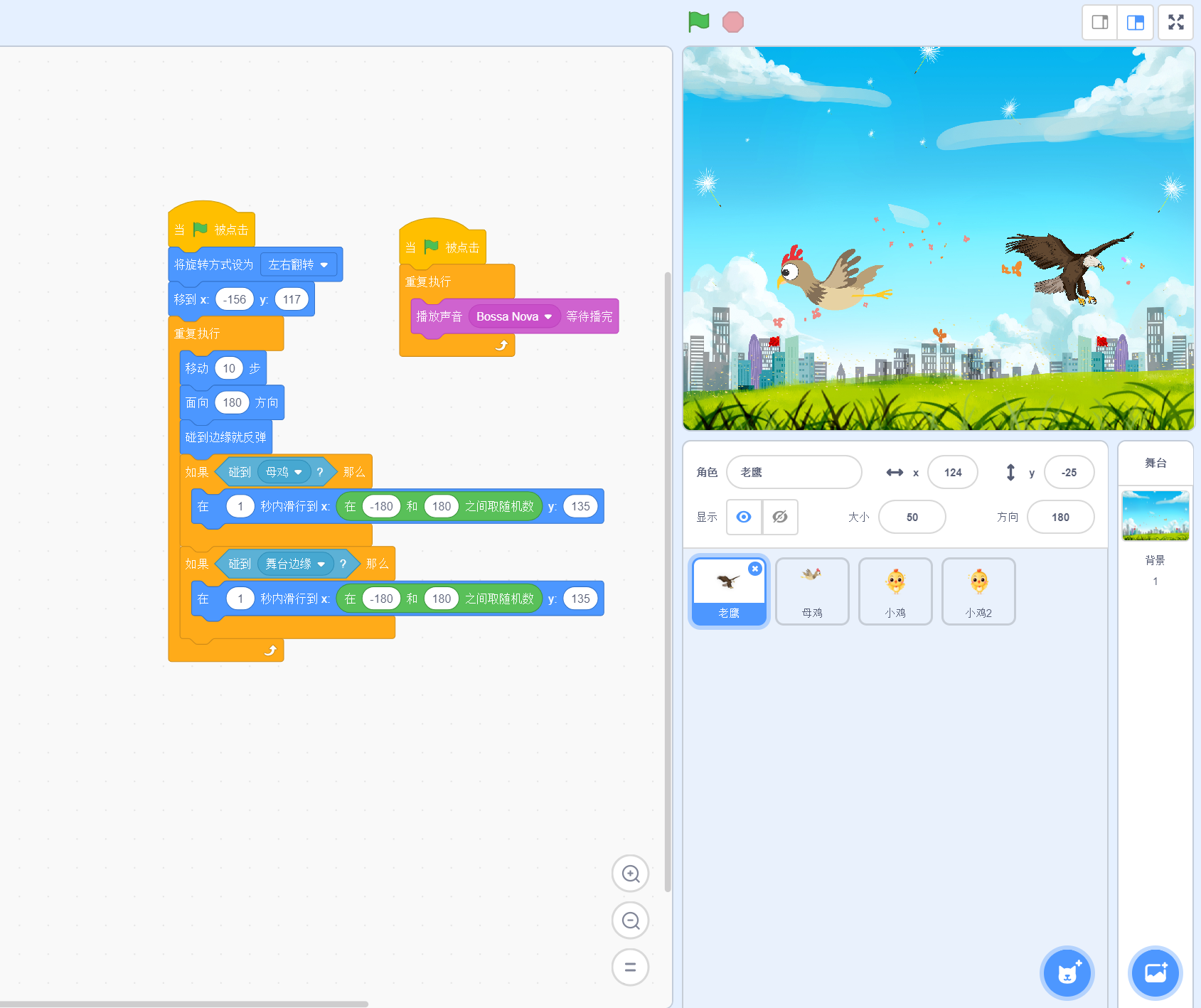 作品介绍: 利用scratch制作超有创意的老鹰捉小鸡; 作品特色: 趣味、创意 作品归类: scratch作品源码 声明:本站所有文章,如无特殊说明或标注,均为本站原创发布。任何个人或组织,在未征得本站同意时,禁止复制、盗用、采集、发布本站内容到任何网站、书籍等各类媒体平台。如若本站内容侵犯了原著者的合法权益,可联系我们进行处理。